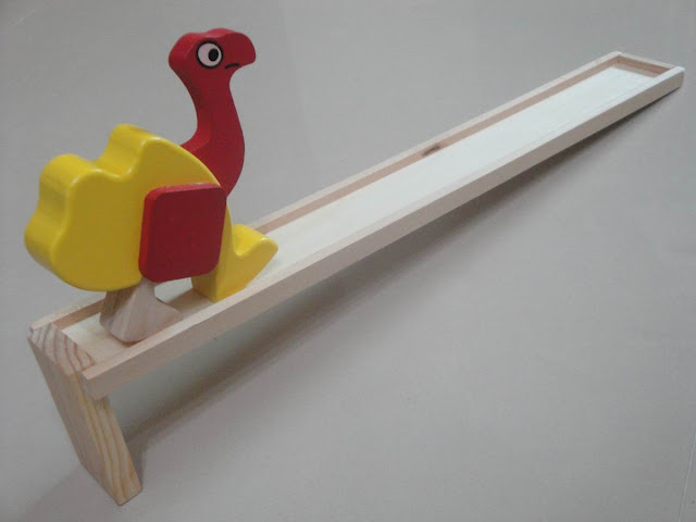 在旗津的老街上買到木製玩具-快樂的鴕鳥,雖然不知道它快不快樂,但確定的是能讓人想動動它,聽聽腳步聲。這是第二組工廠大量製造的自走玩具,所以斜面、重心與摩擦力、擺幅與週期之類的可探究因素就不再贅述。